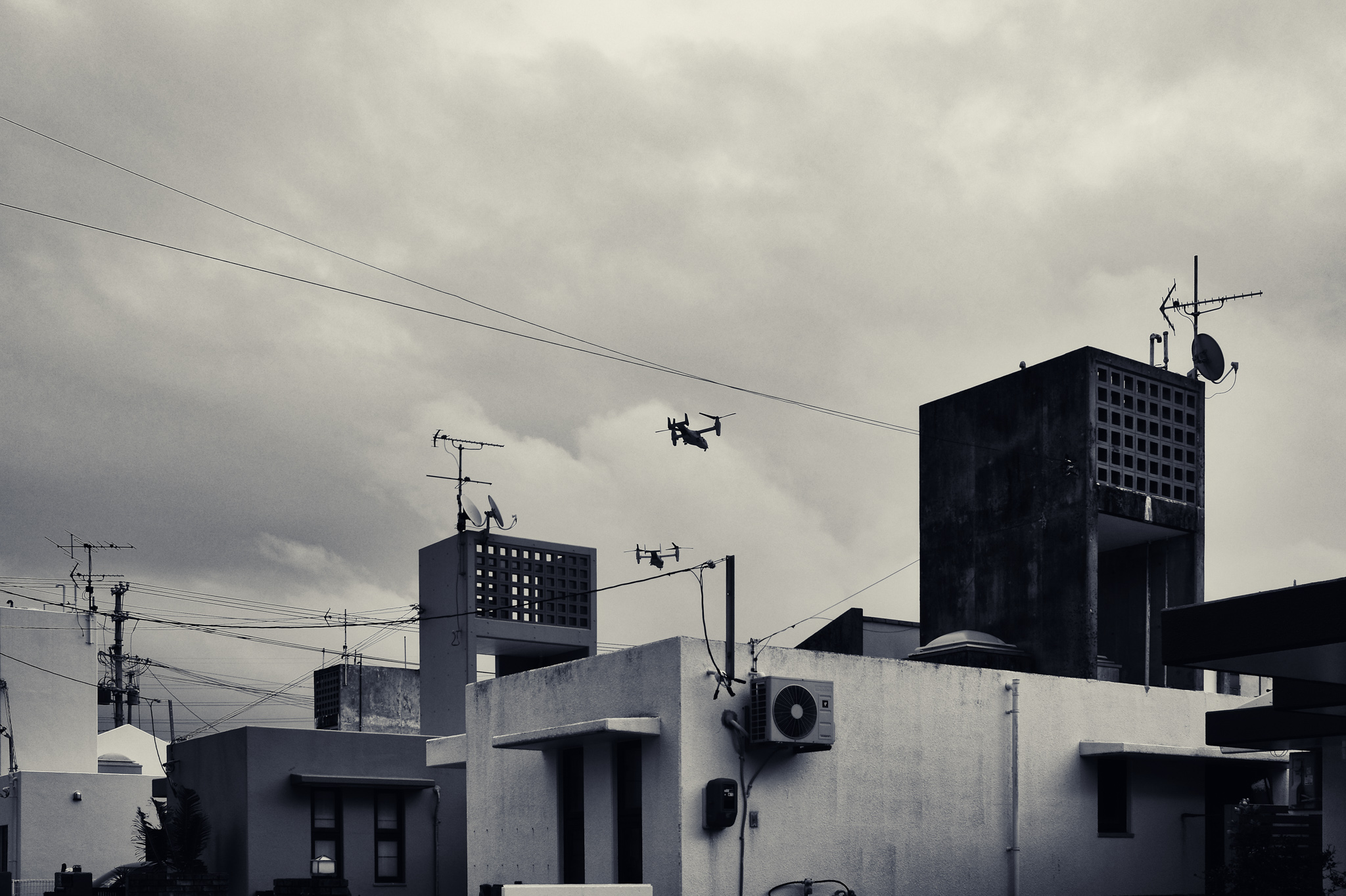 Yet it’s in the skies that the presence is most imposing, where fighter planes’ thunderous roars routinely echo above as pilots perform their aerial training drills, flights of raven colored helicopters make their rounds, blades thwacking insistently, and huge military transporters disappear with a low rumble behind tower blocks on their descent to land.